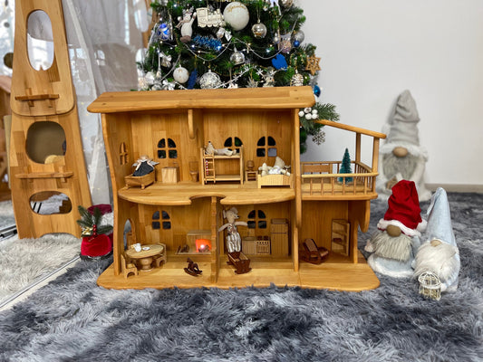 Kids gift Wooden Waldorf Dollhouse Christmas 1st Birthday gift 1:16 Scale Alder-wood Fairy house with Fireplace Red-wood Furniture Eco toy