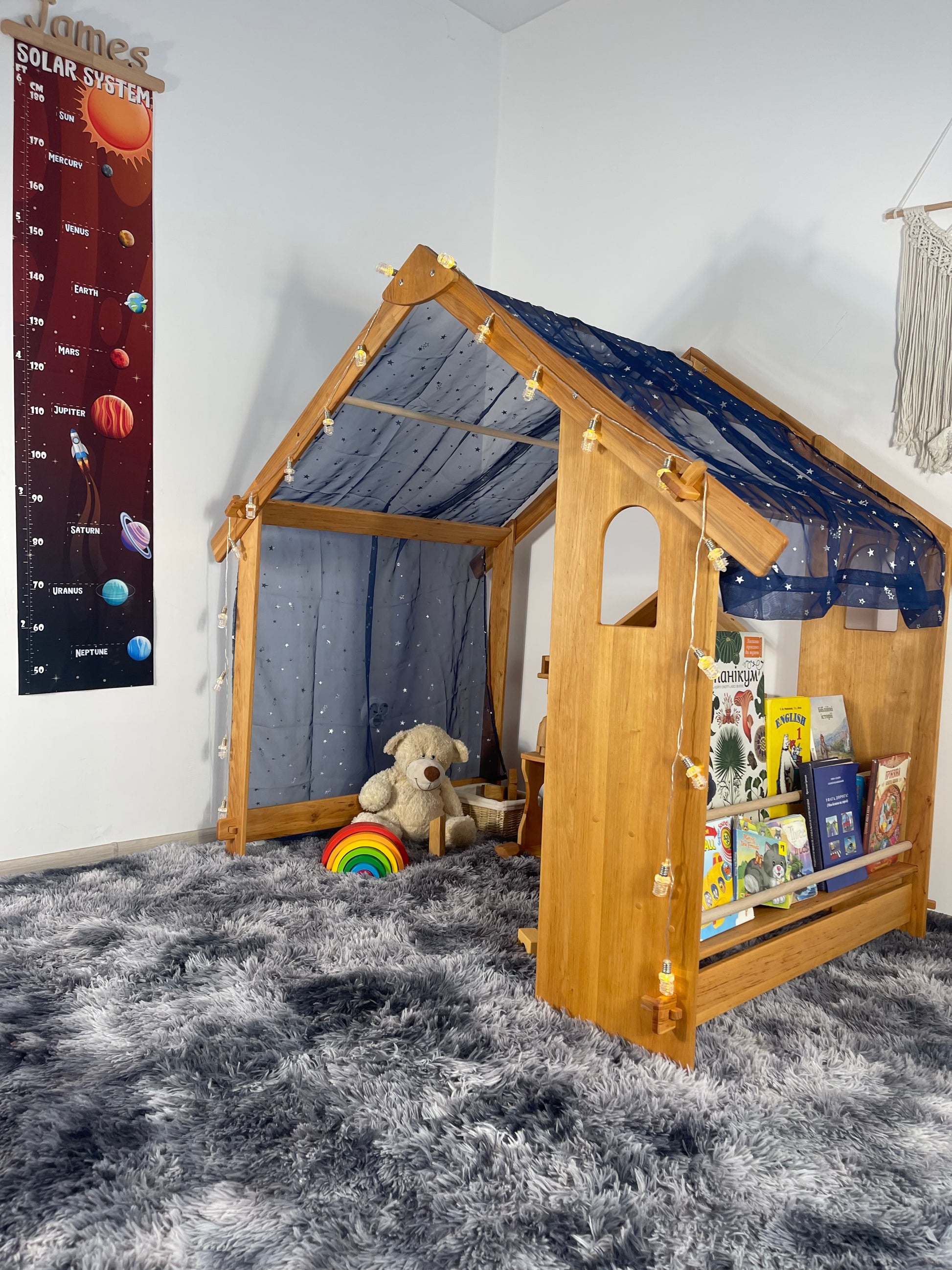 Minimalist and airy, ready to be personalized with string lights, curtains, or seasonal décor. The open sides inspire creativity and flexible use—from pretend kitchens to reading nooks.